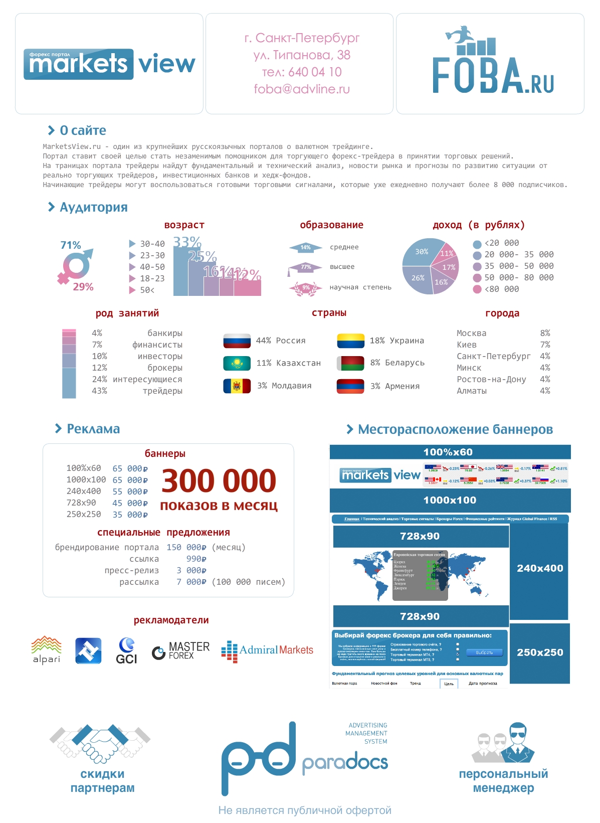 один из крупнейших русскоязычных порталов о валютном трейдинге. Портал ставит своей целью стать незаменимым помощником для торгующего форекс-трейдера в принятии решений. На страницах Marketsview.ru трейдеры найдут фундаментальный и технический анализ, новости рынка и прогнозы по развитию ситуации от реально торгующих трейдеров, инвестиционных банков и хедж-фондов. 300 000 показов в месяц